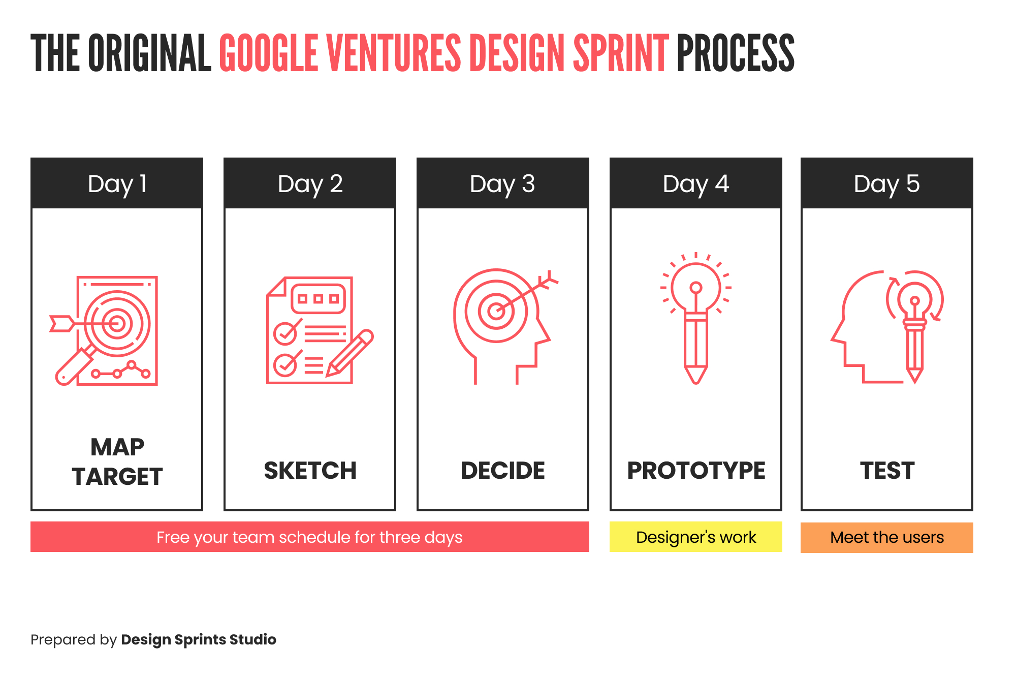 The original Design Sprint, by Jake Knapp, took five days and looked like this:
